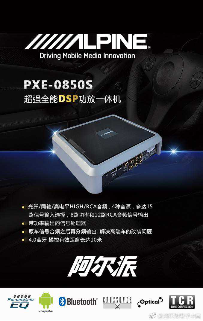 推荐使用的这款阿尔派0850DSP方案,6声道输入,8声道输出,可以满足车上所有喇叭驱动。高音,中音,低音,中置,超低音