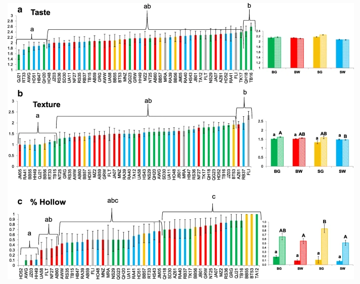 苦味:存在/不存在。味道:1-好吃,3-不好吃。质地:1-硬而脆,3-软。空心果(果皮和胎盘之间的空间):存在/不存在(图1d)。