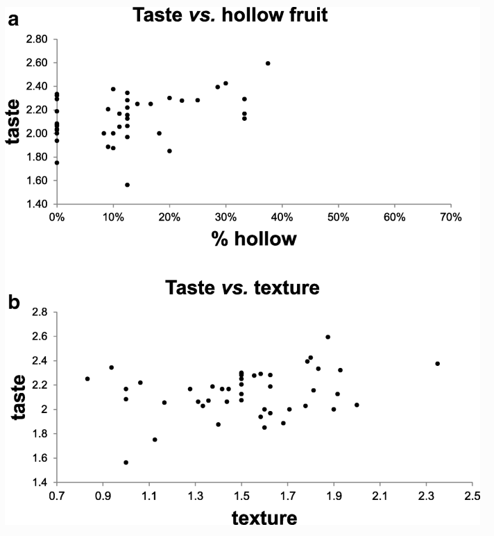 对于味道和质地的评估,在每次收获时,由三名参与者组成的团队对每株植物的两个果实进行分析。