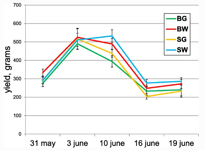 由于2015年的春季寒冷,4月期间发育缓慢。幼苗被疏伐至单株/位置。播种后约55天开始收获,每3-4天持续一次,一直持续到6月下旬,当田地开始衰退时,对种子的缺水和疾病发展进行观测,并去到田间定期监测病虫害。