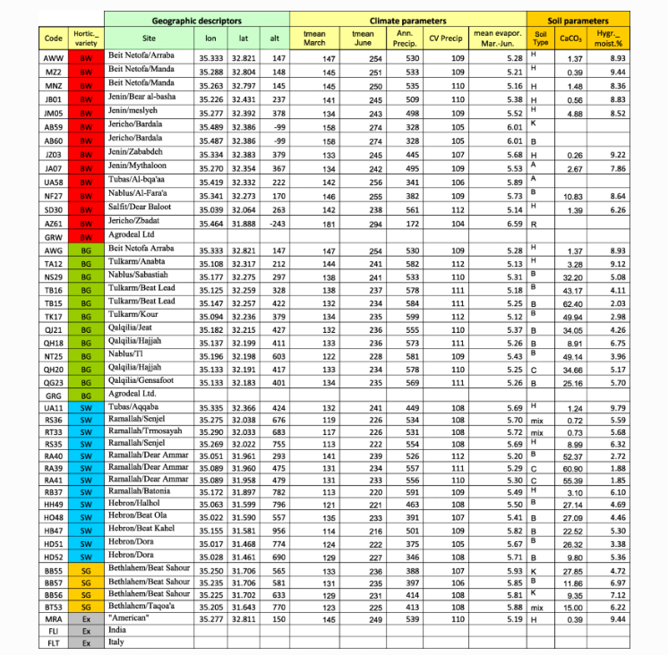 这些地点的季节性温度、年降水量和土壤类型各不相同。这些种群属于四个园艺品种:Baladi,果实长,多皱纹,进一步分为浅绿色(“白色”)和深绿色(“绿色”)两种形式,Sahouri,果实较短,直而平行果皮上有沟纹,同样分为白色和绿色两种。