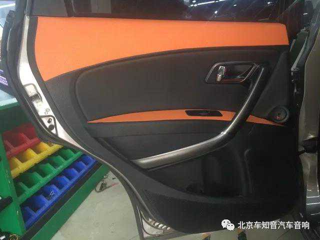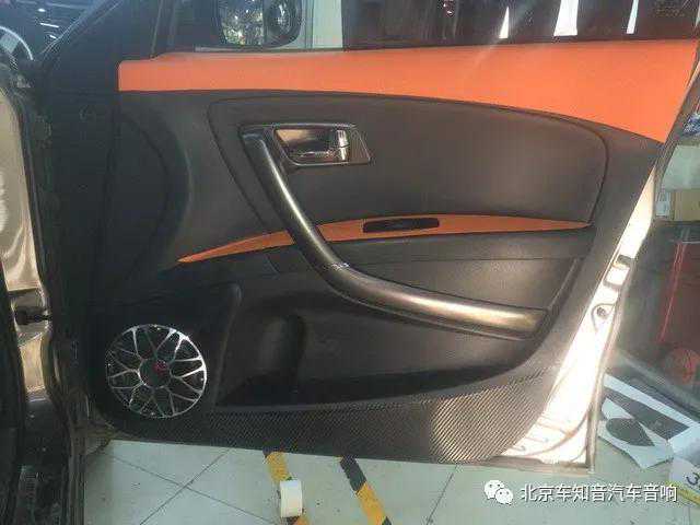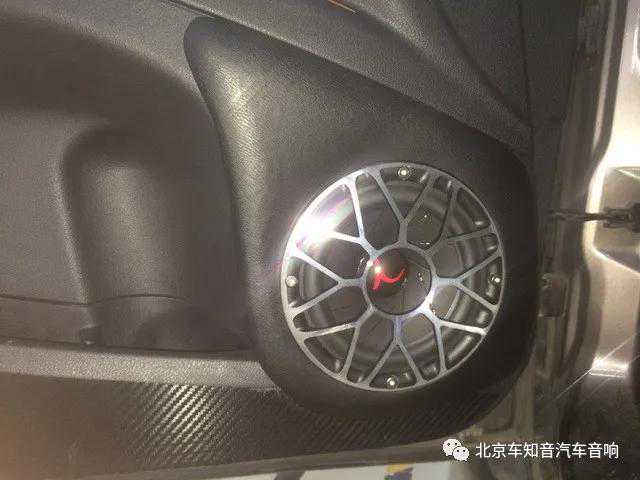 在使用美高隔音材料对门板做了隔音处理之后,北京车知音的改装技师,将汽车的前声场喇叭,替换成了绅士宝三分频套装喇叭,它的高音和中音单元,通过倒模安装工艺安装在了汽车的A柱,这可以将音乐做到中央,让车主处于最佳的位置。而绅士宝中低音单元则安装在了门板原位,并添加了金属保护罩,这既让中低音发挥更加成湖色,同时也给人以很强的视觉冲击力。后声场使用的绅士宝高音单元,则巧妙安装在了门板扶手处,让人感觉像是原装的一般。
