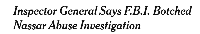 而今天,一份来自美国司法部监察长办公室长119页的调查报告,却曝光了一件更令人发指的事实,引起全国轩然——在受害者终于报案后,联邦调查局(FBI)严重渎职导致了受害者人数激增!
