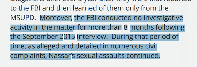 甚至他们已经接到美国奥委会的警告,了解到纳萨尔不光在国家队任职,还在密歇根州立大学任教的情况下,自己不去调查也就算了,也没有通知FBI在密歇根兰辛的办事处注意此人。结果造成了大学在不知情的情况下继续录用纳萨尔,在此期间不断产生受害者。