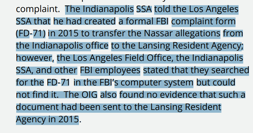 大家猜猜FBI密歇根分部什么时候才知道这件事的?报案后的一年多之后!而且根本不是靠FBI内部通报得知的,而是打开电视,在新闻里看见了纳萨尔性侵大学生被地方警察局调查,才知道有这号人物。