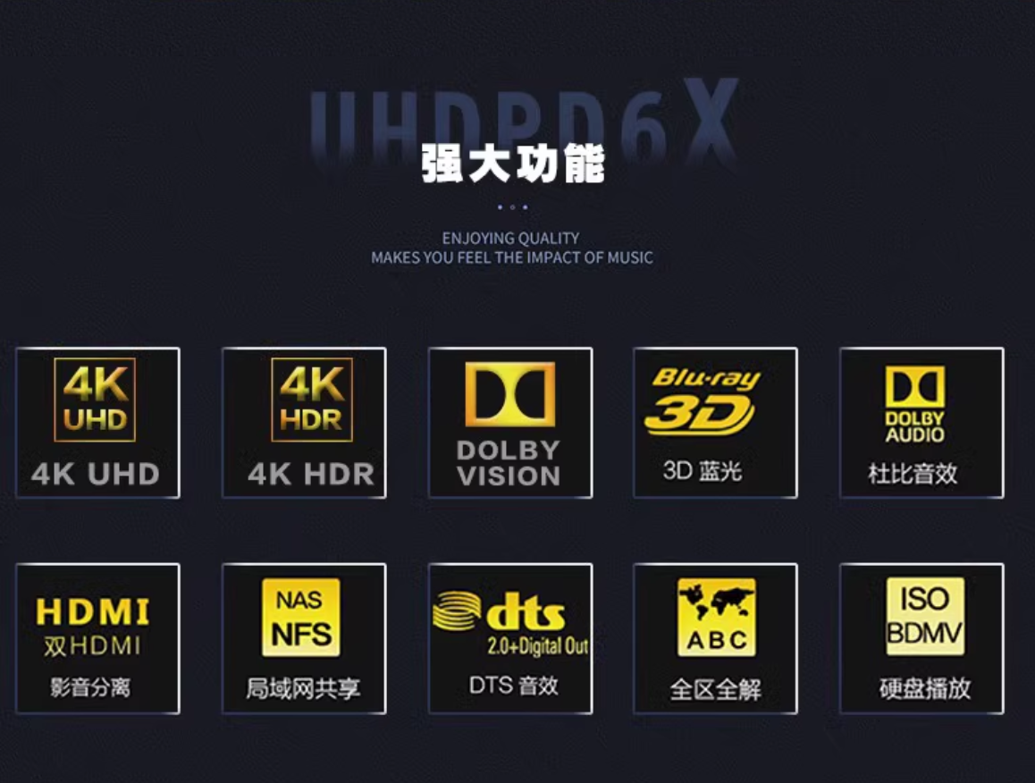 PD6X采用全封闭防尘抗震光驱,车载级抗震弹簧托盘,金属光驱外壳,搭载索尼481AAA4K蓝光机芯,多重保护减少读碟时转盘高速转运产生的振动与噪音,让读碟过程安静平稳迅速稳定。