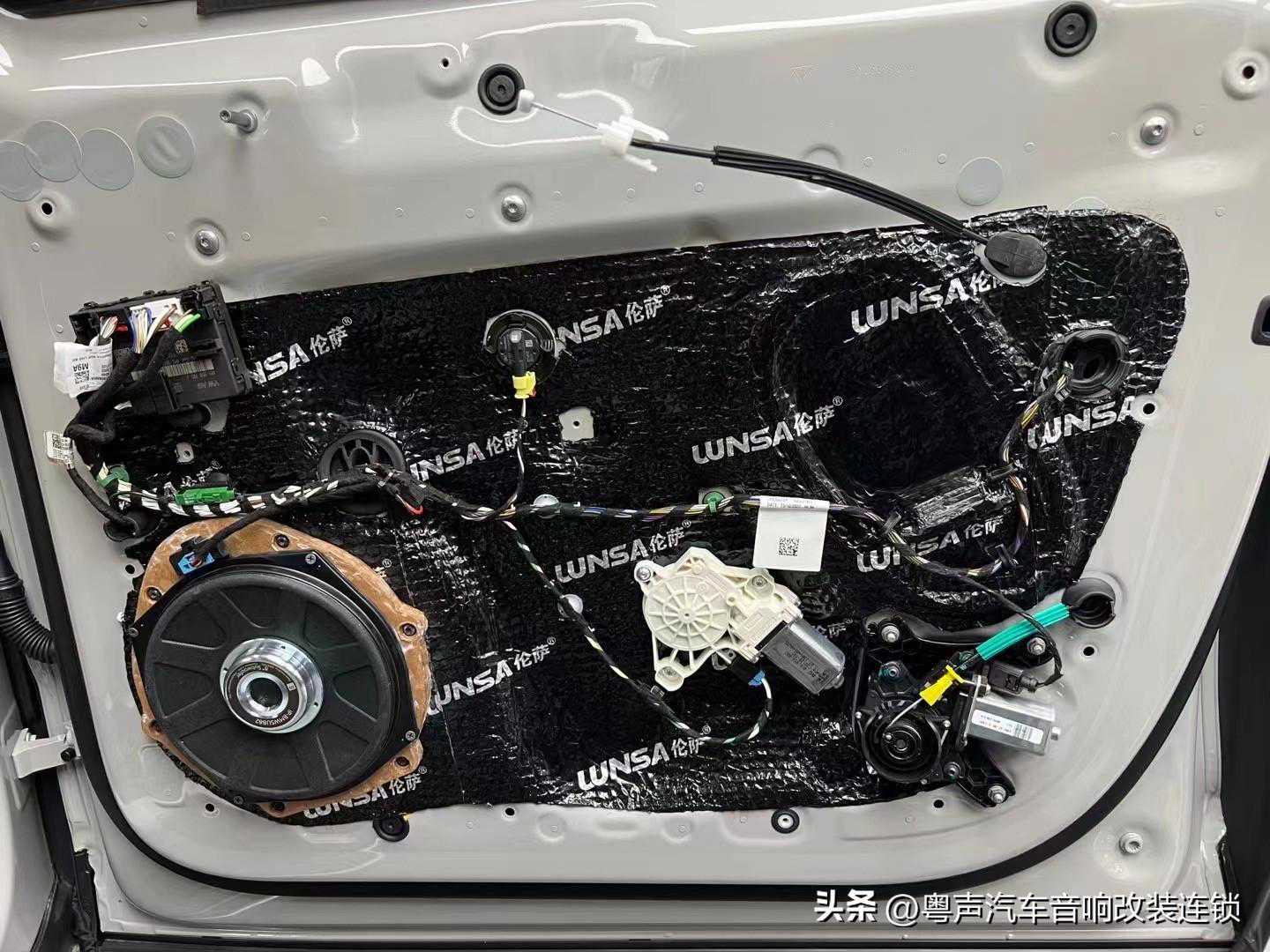 首先,为了减少外界噪音对车内环境的干扰,所以对四门做了【伦萨】双层隔音处理,起到隔音止振的作用,同时给喇叭提供了一个优良的工作环境,让喇叭的音质效果更好。