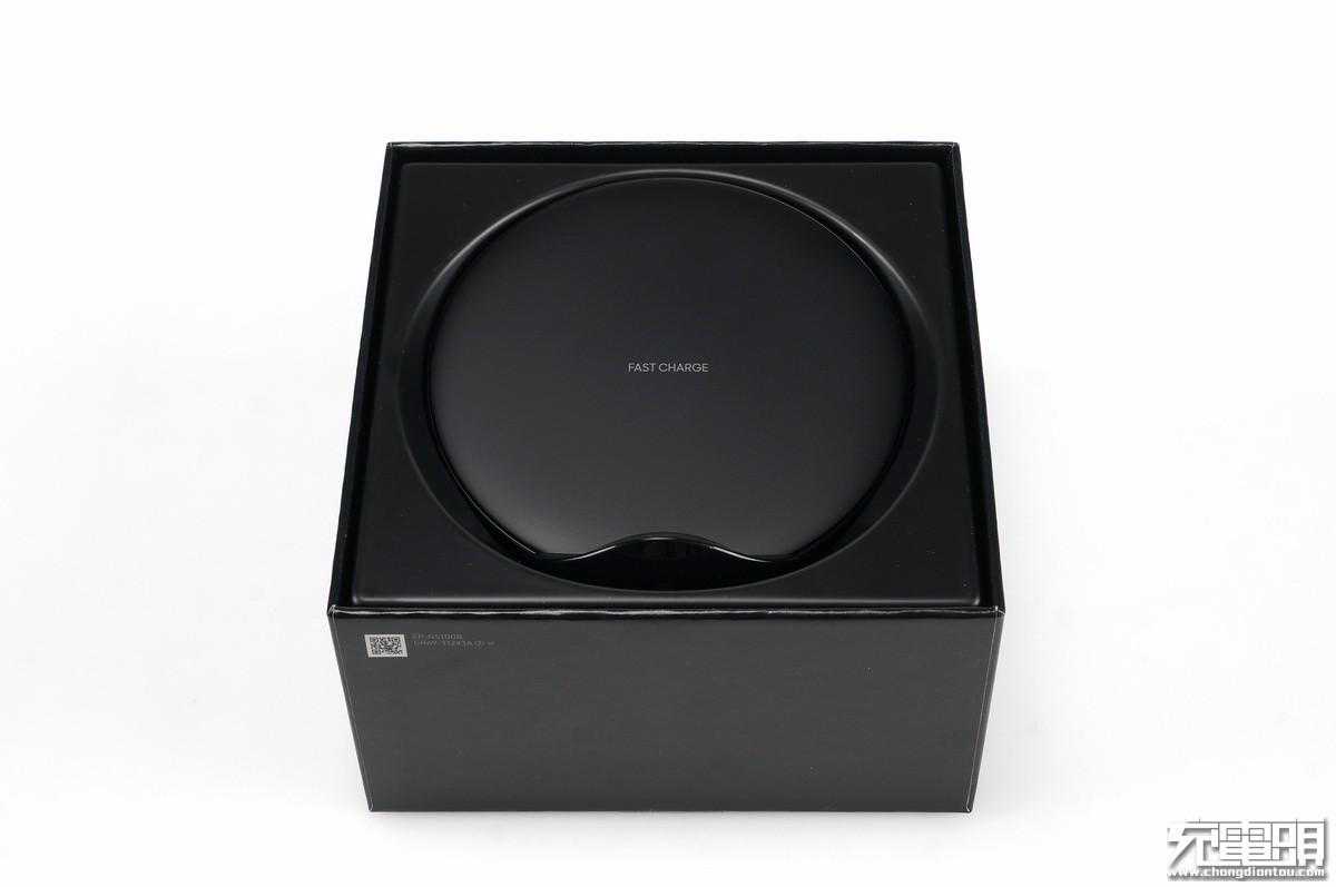打开包装,圆形造型的充电器本体安静的躺在里面,无线充电器正面标有“FASTCHARGE”字样,表明支持无线快充。