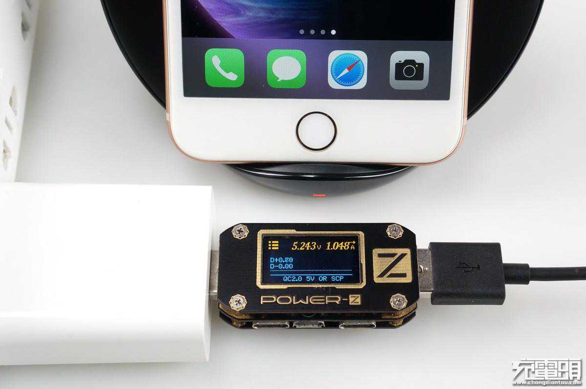 使用ChargerLAB出品的POWER-ZKM001便携式USBPD测试仪测试,发现这款无线充电器支持iPhone8Plus普通5W充电,不支持无线快充。