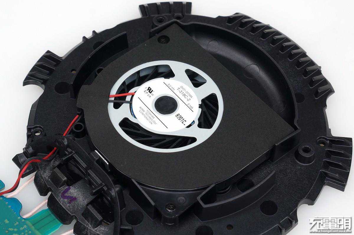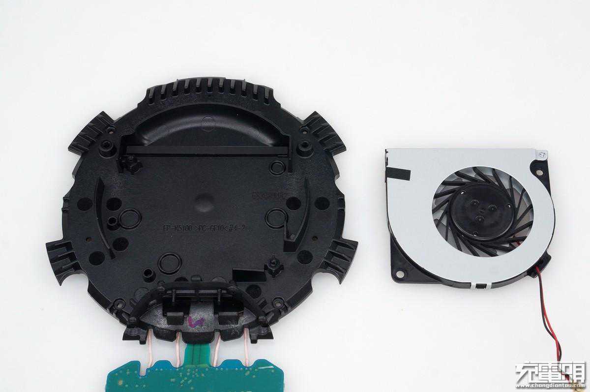 内构件一览图,包含主动散热用的风扇、线圈、隔磁板、PCB。
