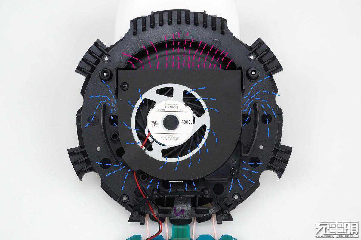 与壳体外面散热孔的对应关系,充电头网小编把进排风对应的散热孔加上上色,蓝色是冷风进气孔,红色是热风排气孔。