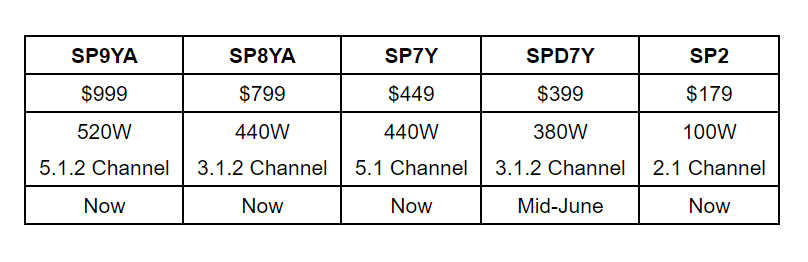 新产品包含SP2、SPD7Y、SP7Y、SP8YA、SP9YA这几款,规格覆盖2.1声道至5.1.2声道,最低价格179美元。