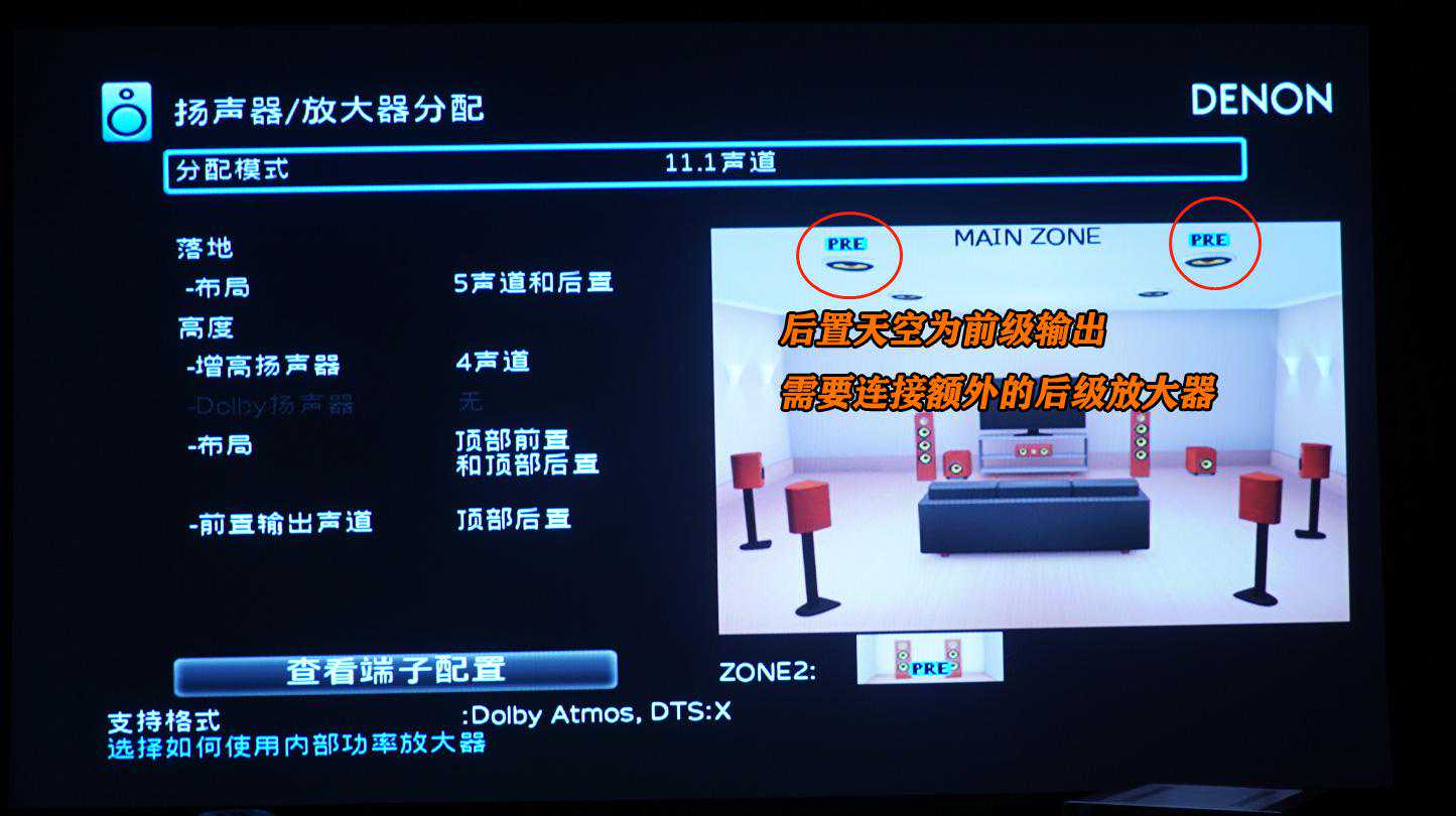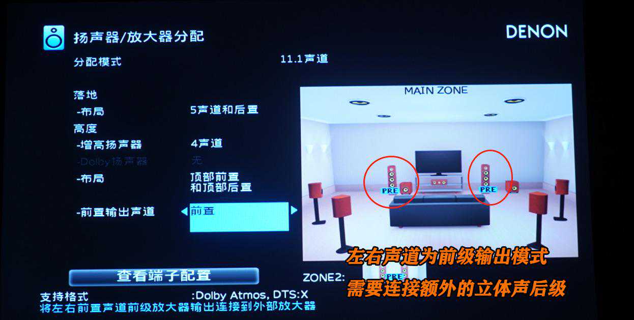 好了,讲正事!!大家注意上图,在主箱上面有两个PRE的标识。这代表在这个设置之下,AVR-X3600H的主声道喇叭驱动端子是断开的,他会给前级输出信号,这里需要给AVR-X3600H连接一台立体声后级,这样才能玩起来7.1.4的家庭影院。