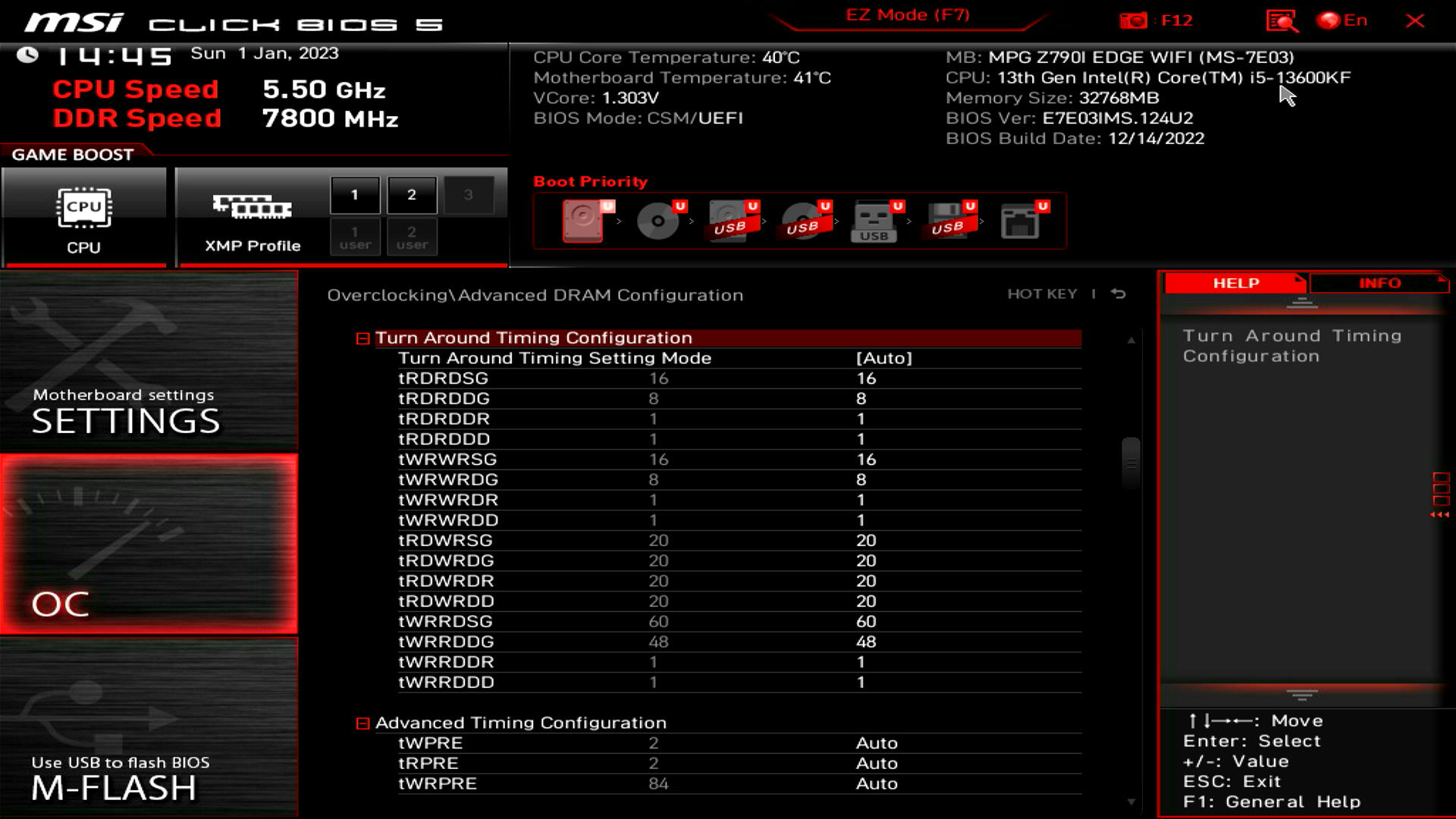 ▲锁全核5.5g的时候,Auto给的CPU电压会非常高,温度也很感人,我们需要去OC界面VoltageSetting里的CPUCoreVoltage手动降压,大家可以从1.250V开始试,进系统跑30分钟R23,报错则加0.010V继续跑测试,直到找到不报错的电压,再手动加0.010V即可日常稳定使用。
