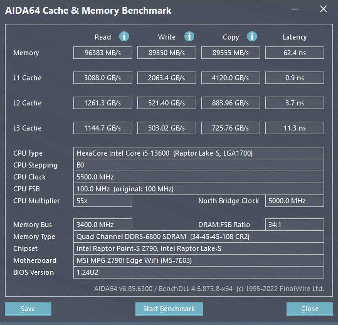 6800C34:读取96383MB/s,写入89550MB/s,复制89555MB/s,延迟62.4ns。