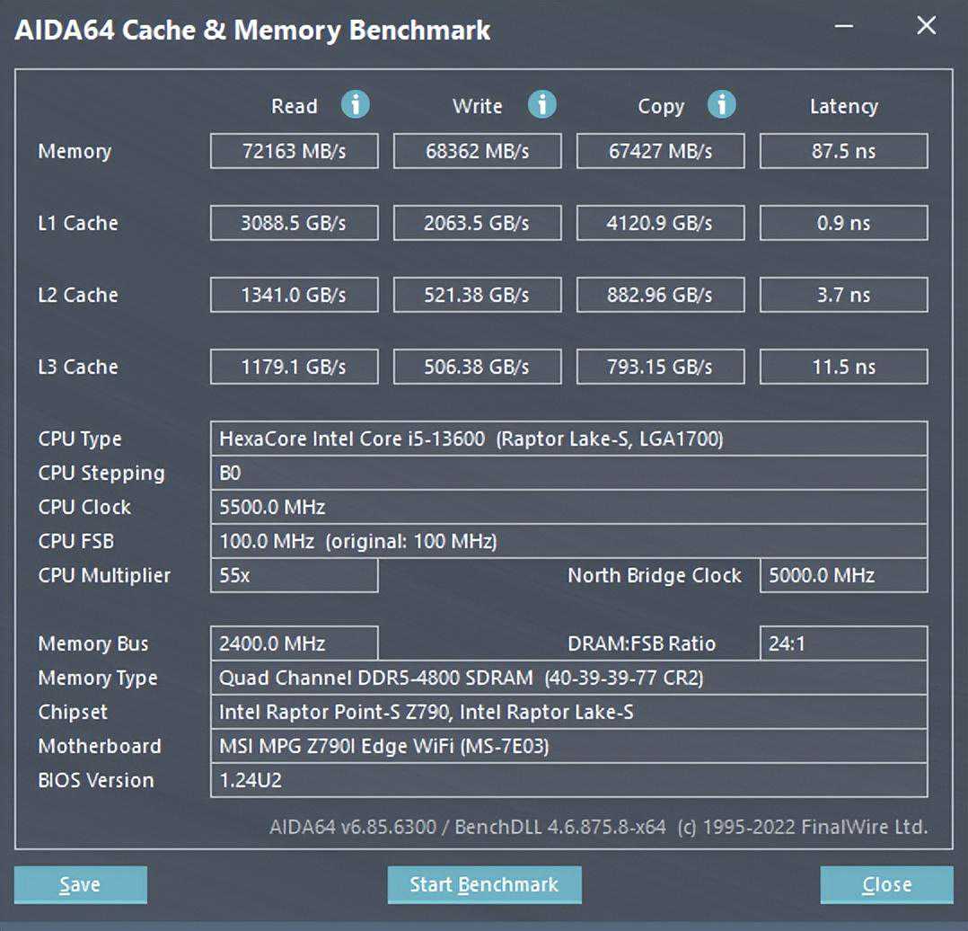 基频4800:读取72163MB/s,写入68362MB/s,复制67427MB/s,延迟87.5ns。