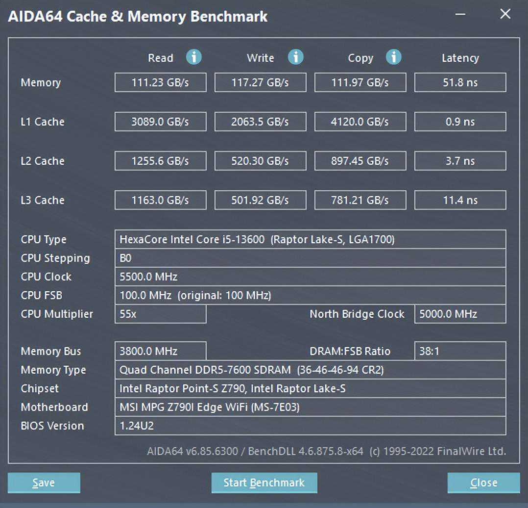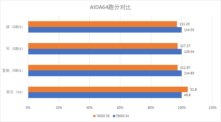 7800C34:读取114.55GB/s,写入120.44GB/s,复制114.83GB/s,延迟49.8ns。