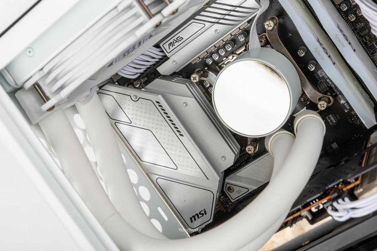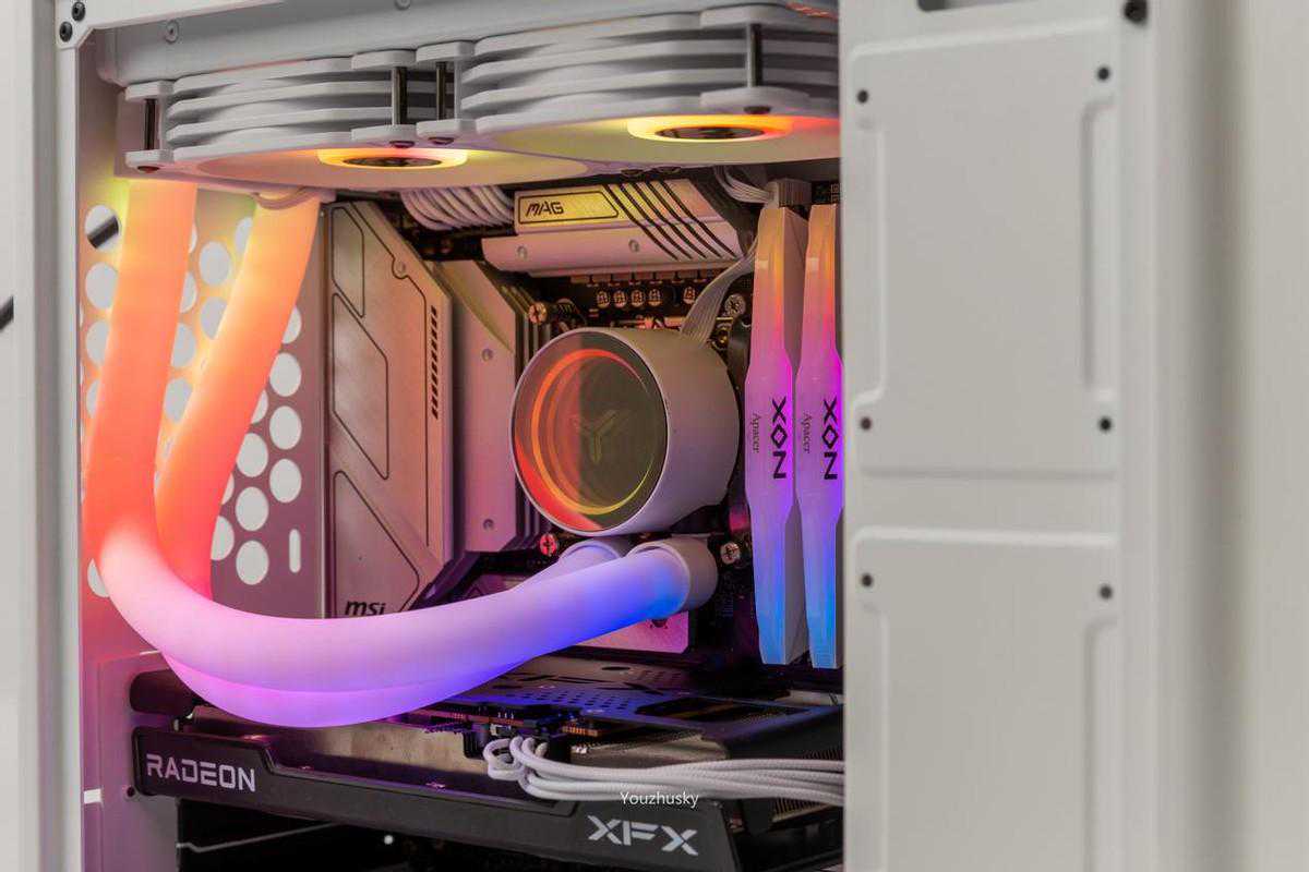 侧面看内部微星B660M迫击炮主板和乔思伯光影240水冷,以及讯景RX6600黑狼显卡