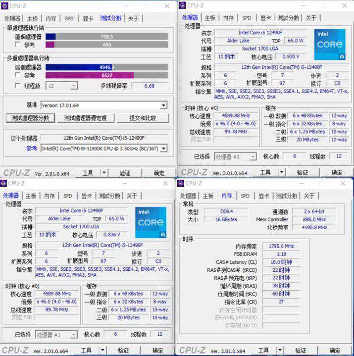 i512490F性能还是不弱CPU-Z测试单核739.3、多核4946.2,和11900K的单核多核也都能打得有来有回