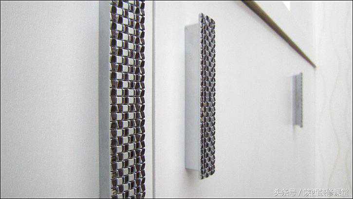 鞋柜柜门拉手的细节图,家里厨房、浴柜之外的家具柜门全部都是用这一种型号的拉手,网购自【军yún家居专营店】的96mm孔距亮铬马赛克拉手。