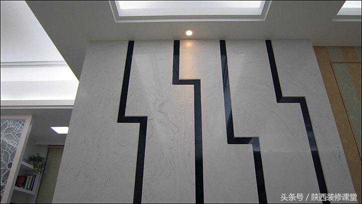 玄关背景墙是用【雅士白人造石】和【黑金沙花岗岩】两种石料做的,为了保持白色石料图案的连续性同时节约材料,采用专门的石材水切割机来切,效果非常棒!黑色部分因为不明显,所以只需要用45度斜切的小段石料拼接再填缝就可以了。