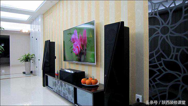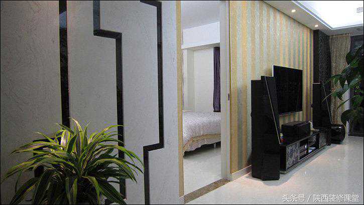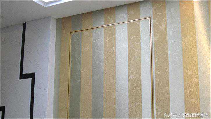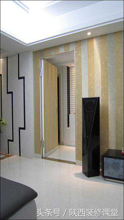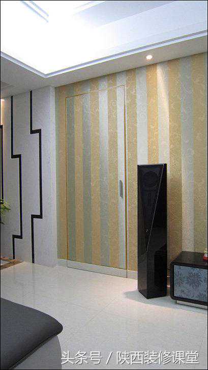 电视背景墙贴的是墙布,要的就是整幅无接缝的效果,当然啦,在隐形门的地方不得不出现了小小的门框和把手,这也是没办法的事。如果没有门框,门使用时间长了门边上的墙布一定会剥落;如果没有把手,手接触到的地方久了一定很脏。鱼与熊掌不可兼得,取个折中吧。