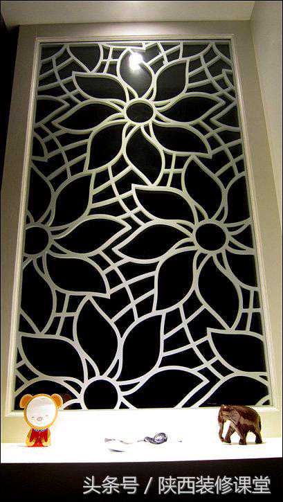 阳台门边的黑镜。这个地方是房子的承重墙,因为电视背景墙后退了十公分所以就像是突出了一根柱子,用带图案的黑镜包起来与左边玄关背景墙的白色形成鲜明的对比,大大的太阳花图案和鞋柜上的木通花一样。