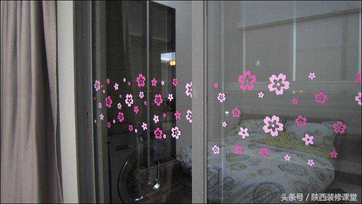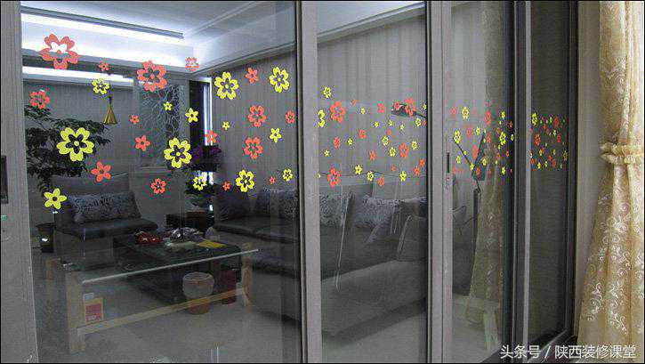 阳台门之前临时贴上的红色胶带终于可以换掉了,花了一个钟头,和小朋友一起把从【云诺家jū旗舰店】网购的164朵玻璃贴花一朵一朵地贴上去,大家觉得效果如何?