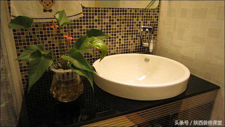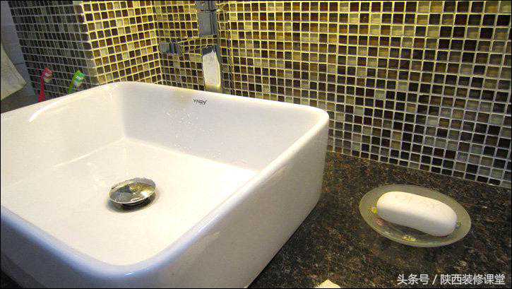 方形的台上盆没有溢水孔,所以平时使用的时候得比较留心。又见水晶棕玻璃马赛克。
