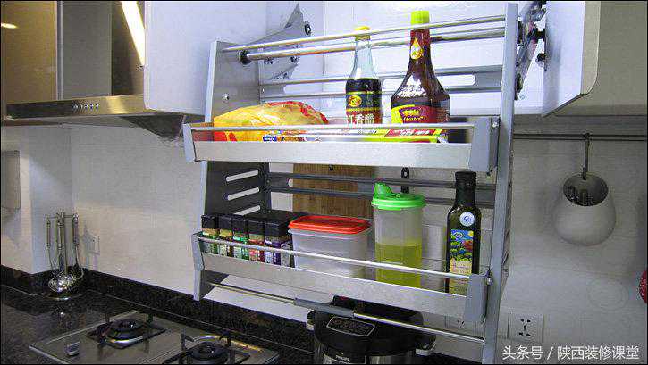 抽油烟机右边安装了一个吊柜升降拉蓝,调味品全部放置在这里,需要的时候,打开门,随手……