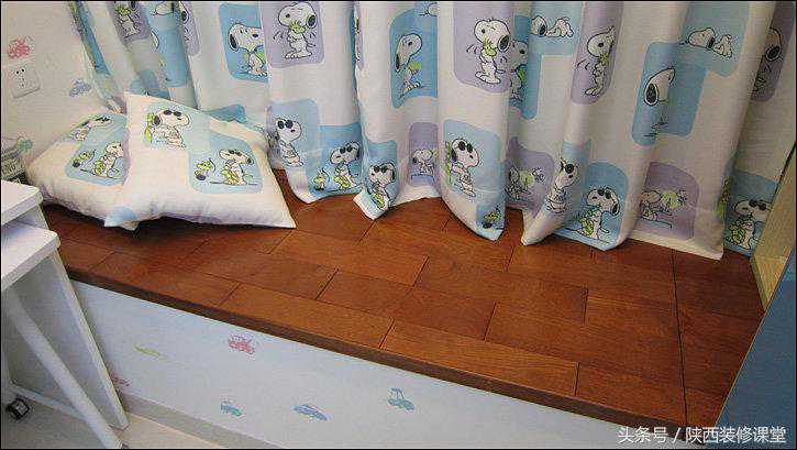 飘窗上铺的是实木地板,坐在这上面看书也行,躺着休息也行,舒服!