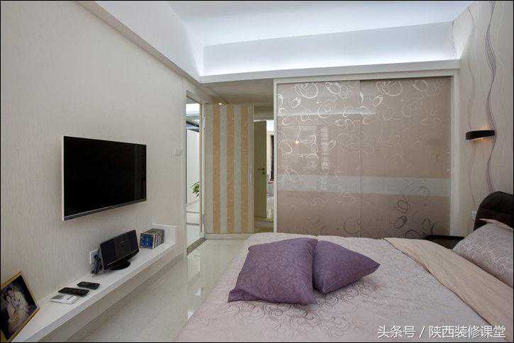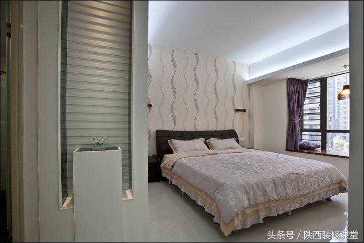 1.8米大床是一定要的!背景墙用的是螺旋纹理壁纸,浅紫******案和窗帘、衣柜门的颜色非常协调。