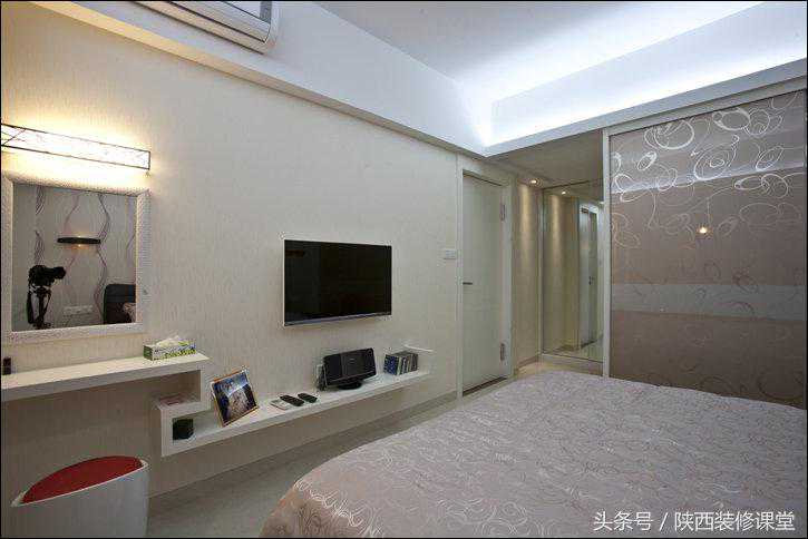 梳妆台、电视柜一体化,通常大家在卧室里装的都是32寸电视吧,楼主我喜欢大的,装了37寸的,下面是个飞利浦的床头音响,放CD、插iPhone那是再好不过的。