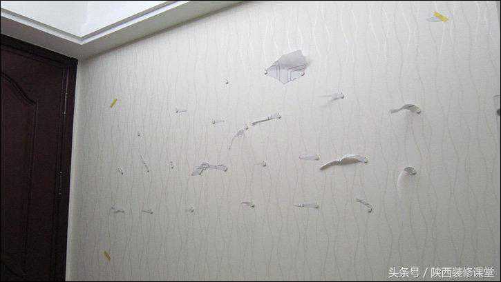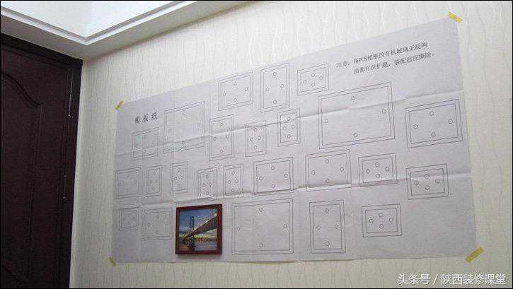 4、想来这模板纸也不会再用第二次了吧,撕掉!哎呀……撕了就不知道哪个挂钩怎么挂哪种大小的相框了呀,这可如何是好……