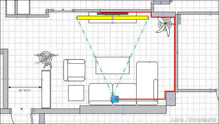 2、同样原来没有做幕布槽,又要避开壁挂的电视,所以幕布(图中黄色部分)只能用吊装电动幕。电动幕的电源初步考虑是从电视背景墙的射灯取(因为平时也基本不开)。
