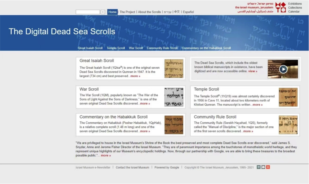 洞穴1是1946或者1947年发现的,而洞穴12则是2017年才发现的,整个时间跨度非常长,法国以及以色列等国的学者不断进行勘测,试图寻找更多的洞穴,更多的卷子,而贝都因人也在加班加点地寻找。到现在为止,我们一共看到了12个洞穴,其中第4个洞穴的出土文献是最多的。在所有卷子里,《圣殿卷子》是最长的,在六日战争之后由堪多卖给了亚丁,即苏克尼克的儿子。所有这些卷子大部分都存放在了“圣书之龛”和洛克菲勒博物馆,并且这两处现在都归以色列博物馆管理,还有少部分藏于芝加哥大学东方研究所。此外,铜质卷子藏于安曼的约旦博物馆。铜质卷子很神奇,它基本是一个藏宝图,上面有金银财宝埋藏的位置。当时对古卷进行整理的其中一个人还真的去找了,但是什么也没有找到。即使当时真的埋藏了宝藏,这么多年也应该早就被人发现并拿走了。