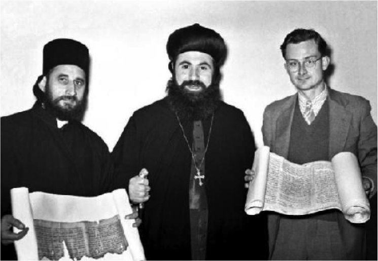 这些照片我也是从他的传记以及一些其他的书信集中找来的,穿着教士服的就是都主教撒母耳,旁边的就是他的一个好朋友,也是伯利恒当地很有名的人,他拥有一间出租车公司,在当地人脉极广,名叫安东·基拉兹。基拉兹这个词在土耳其语里就是大樱桃或者车厘子的意思。撒母耳和基拉兹都是在奥斯曼土耳其对境内基督徒进行种族清洗时逃出来的。基拉兹其实就是现在一位很有名的学者乔治·基拉兹的父亲。基拉兹给犹太学者苏克尼克看了最初从贝都因人那里买的四份卷子,但是撒母耳并没有卖掉这四份卷子。当时大家也在纳闷他为什么没有卖,有人说他想卖个高价,他最后也确实是这样做了。但据他自己所说,他想卖高价的原因是因为要把这个钱给摩苏尔等地,来维修那些被奥斯曼土耳其毁坏了的叙利亚正教会教堂。这些叙利亚正教会的人并不太能够确定这些古卷是否靠谱,所以先是联系了犹太人,之后又开始联系美国学者。1948年2月,都主教撒母耳就去了耶路撒冷的美国学院。他找到当时的一位年轻学者叫特莱沃,然后特莱沃拍了照片,又给一个特别有名的考古学家奥尔布赖特发了信函。奥尔布赖特随即确定这肯定是珍贵的文物。在这幅照片中,大家可以看到左边是布特鲁斯·索米,中间是都主教撒母耳,而那个年轻的美国学者就是特莱沃,索米手里拿的是《哈巴谷书注释》,特莱沃拿的是《大以赛亚卷子》。