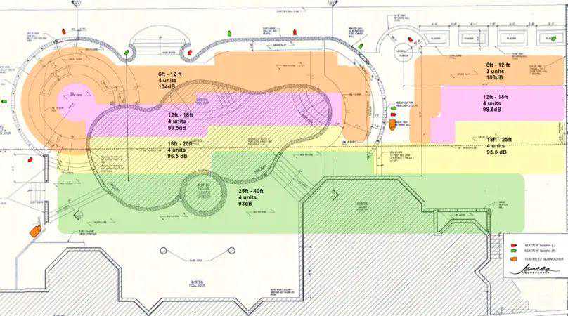 分布式布局:借助超低音/卫星箱组合,由花园边缘处开始设置,声波投向花园内,且分隔一定距离,确保声波在花园空间内均匀覆盖。同时,可以借助DSP处理等方式进行声音微调,以达致平衡。