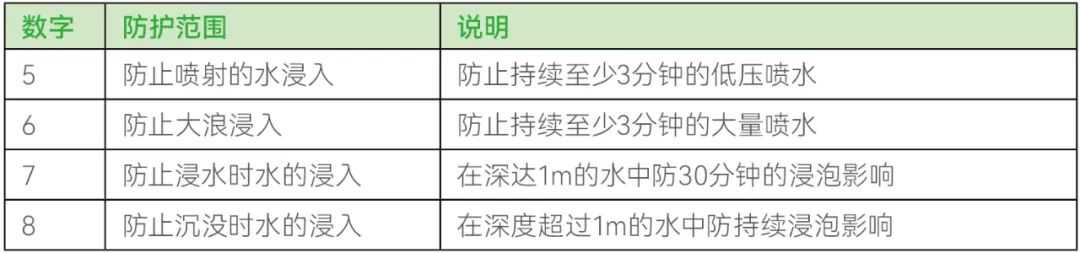 IEC(国际电工委员会)起草的IP(IngressProtection)防护等级对此予以界定,也是目前较为通用的标准。IP防护等级由两个数字组成:第1个数字表示电子产品防尘、防止外物侵入的等级(包括使用工具侵入以及人手不可接触的带电部分等);第2个数字表示电子产品防水、防湿气侵袭的密闭程度。两个数字,都是数值越大表明其防护能力/等级越高。