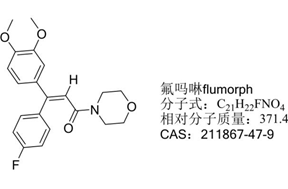 该化合物是在天然产物肉桂酸和仿生杀菌剂烯酰吗啉(dimethomorph)的基础上,引入氟原子而得到的含氟杀菌剂。主要用于防治卵菌纲病原菌引起的黄瓜、葡萄、辣椒、番茄等蔬菜的霜霉病和晚疫病,尤其用于防治抗性病害,推荐剂量下对作物安全、无药害。氟吗啉不仅具有很好的保护作用即预防作用,而且有很好的治疗作用,治疗作用明显优于烯酰吗啉。其作用机理是通过抑制卵菌细胞壁的形成而起作用,因氟原子特有的性能如模拟效应、阻碍效应、渗透效应,致使氟吗啉的杀菌效果倍增。