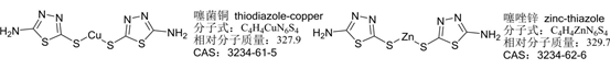 噻菌铜(通用名称:thiodiazole-copper)是由浙江龙湾化工有限公司开发并登记;噻唑锌(通用名称:zinc-thiazole)是浙江新农化工股份有限公司进行开发登记,二者均为噻二唑类有机金属杀细菌剂。