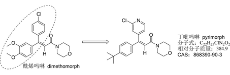 该化合物是在烯酰吗啉(dimethomorph)的基础上,用吡啶环替换苯环,经优化得到。主要防治各类作物疫病,如番茄晚疫病、辣椒疫病、西瓜疫病、马铃薯疫病等。虽然与烯酰吗啉结构类似,但丁吡吗啉对致病疫霉有抑制作用,无杀菌作用,而烯酰吗啉则表现很好的杀菌活性,并且烯酰吗啉有较好的内吸输导活性,而丁吡吗啉治疗效果和内吸输导性较差,这说明两种杀菌剂在作用特性和作用方式上存在差别。
