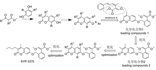 采用中间体衍生化法,以β-酮酸酯为原料合成了数10个不同取代的、且含有羟基的香豆素中间体,并引入甲氧基丙烯酸酯类杀菌剂的结构片段,得到了具有一定杀菌活性的先导化合物1,对R1进行了优化,发现R1固定为甲基活性最好;继而对R2进行优化,当R2位置的氢被甲基替换时,活性有较大的提高,从而发现了先导化合物2;进一步优化,最终发现了杀菌活性最好的SYP-3375。