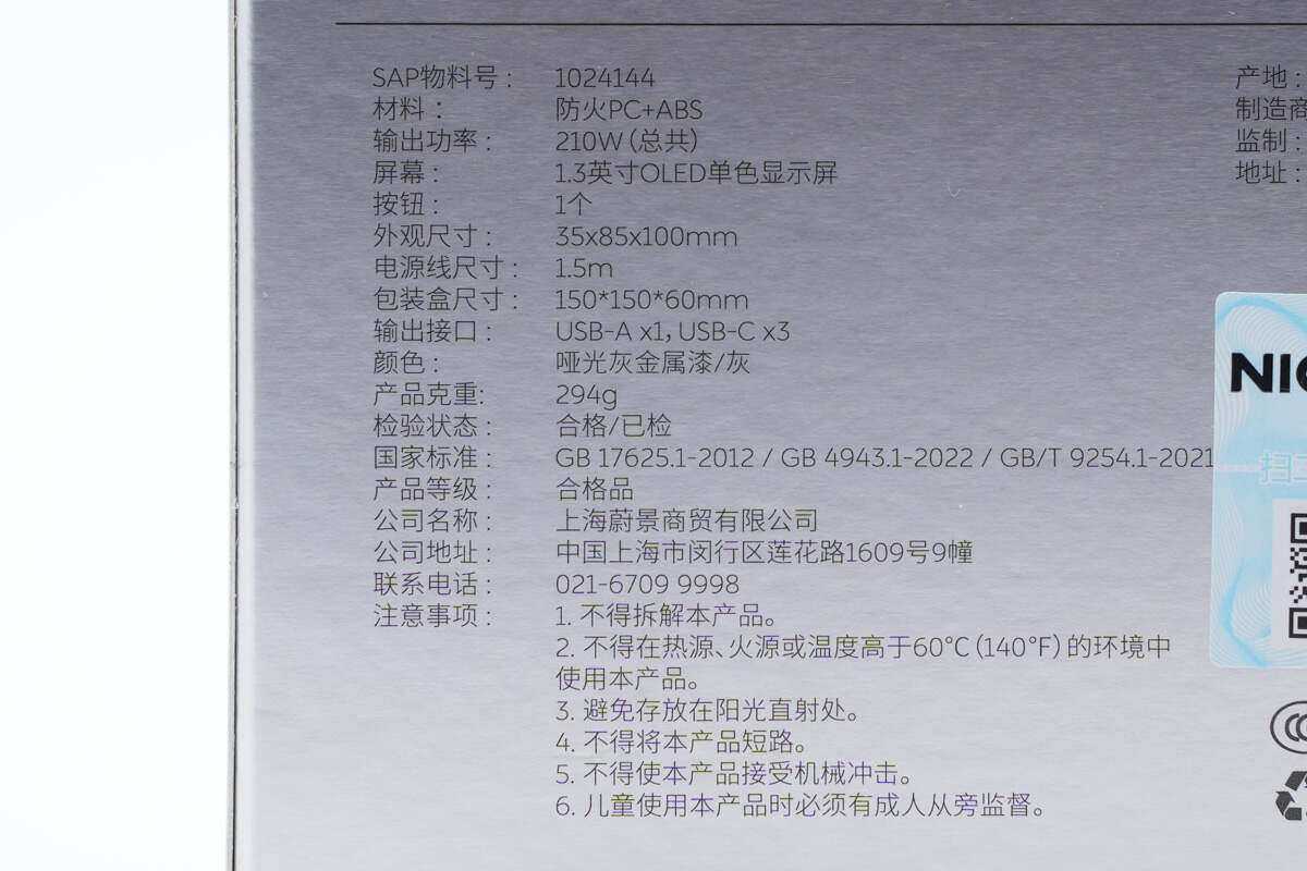 包装内含蔚来NIOLife210W桌面充电器、电源线以及用户手册。