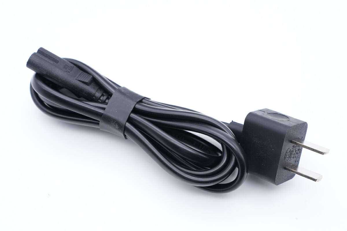 电源线两端分别是双脚插头和8字插头,使用橡胶圈捆扎固定。