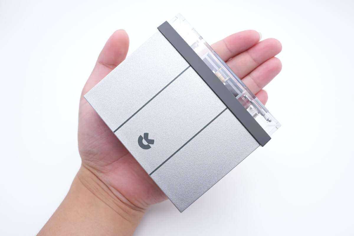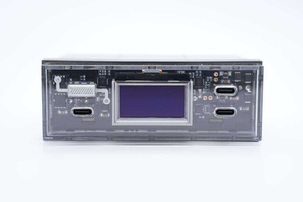 本次拆解的是蔚来和TEGIC联名的一款210W桌面充电器,采用科技感十足的银黑色涂装,为纯充电器设计。壳体前面板采用透明设计,在面板中间布置一块OLED屏幕用于参数显示,面板设有三个USB-C口,在机身背面设有一个USB-A口,总输出功率为210W。OLED显示屏能够显示充电器的功率分配模式,各个接口当前的输出功率,实时监测各个设备的充电状态。