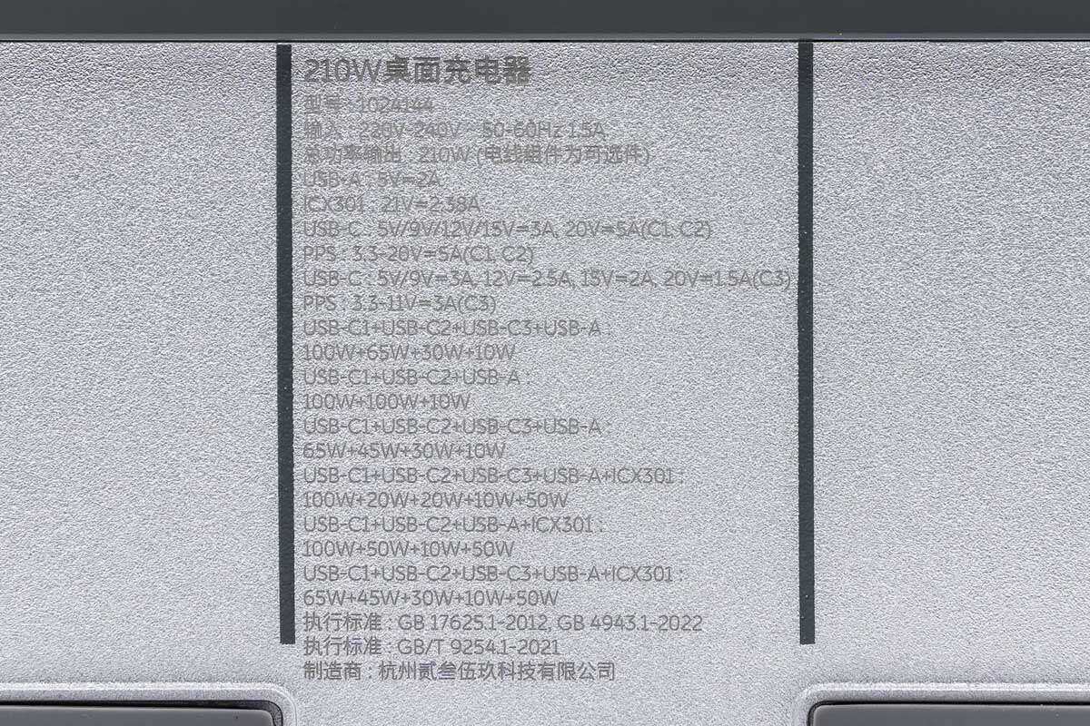 USB-C1与C2接口支持100W输出功率,USB-C3接口支持30W输出功率。在多个设备同时充电时,功率分配策略可进行切换,应对不同设备的功率需求。充电器采用八字线供电,和USB-A口同样设置在背面。充电头网拿到了这款210W桌面充电器,第一时间为大家带来拆解文章,看看内部的方案和设计。