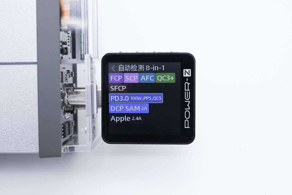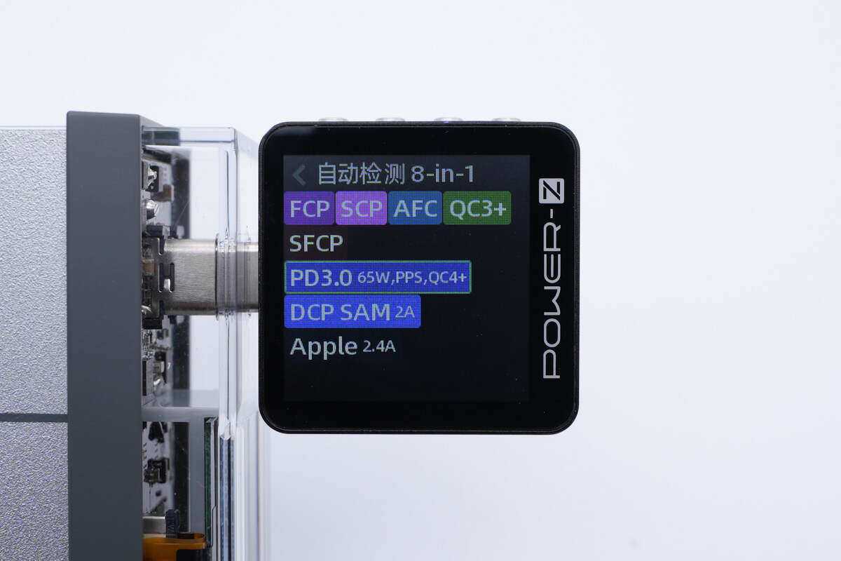 模式A情况下,使用ChargerLABPOWER-ZKM003C测得USB-C1口支持FCP、SCP、AFC、QC3+/5、SFCP、、PPS、DCP、SAM2A、充电协议。