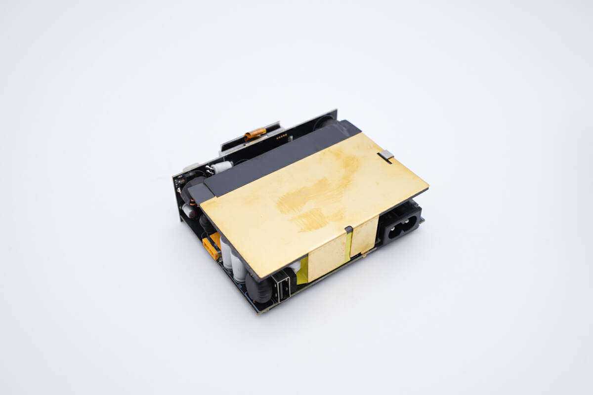 PCBA模块正面覆盖黄铜散热片,对应低压区域粘贴胶带绝缘。