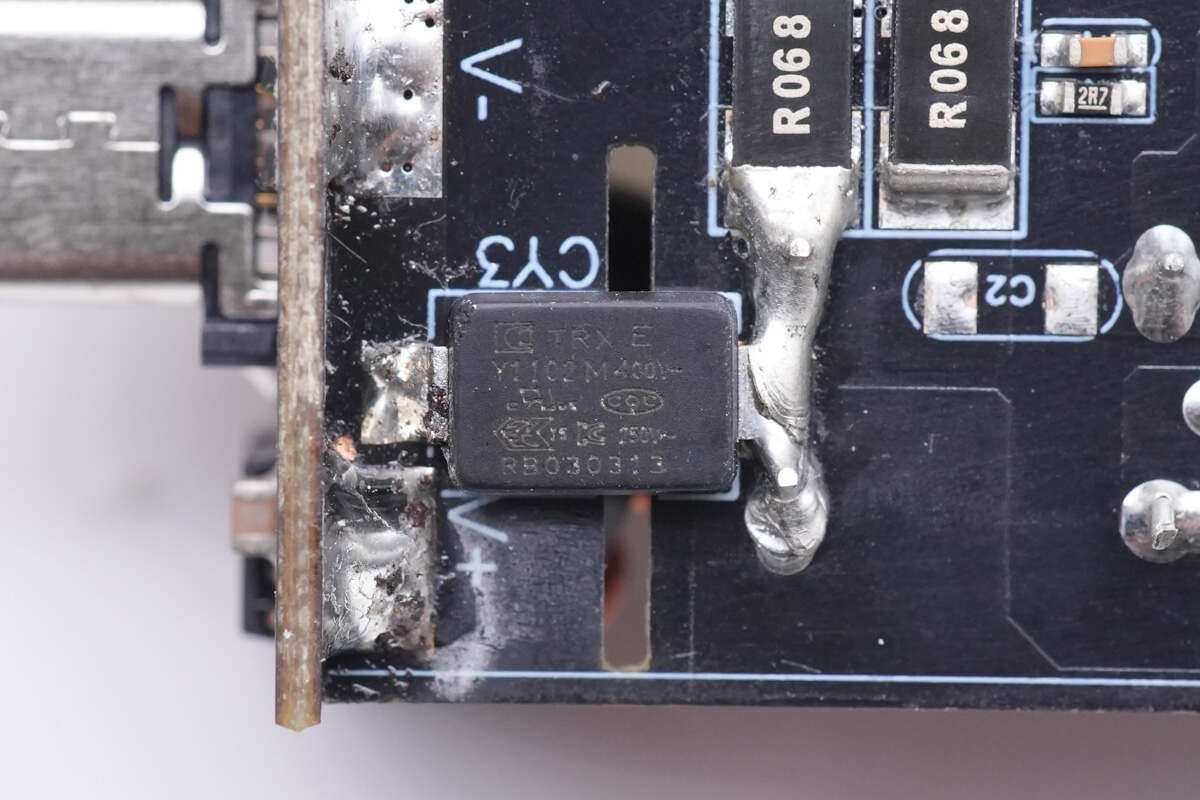 充电器输入端一览,左侧焊接USB-A口降压电感,USB-A接口,变压器,主控芯片供电滤波电容。右侧焊接蓝色压敏电阻和电源输入插座。在电源输入插座右侧焊接保险丝。